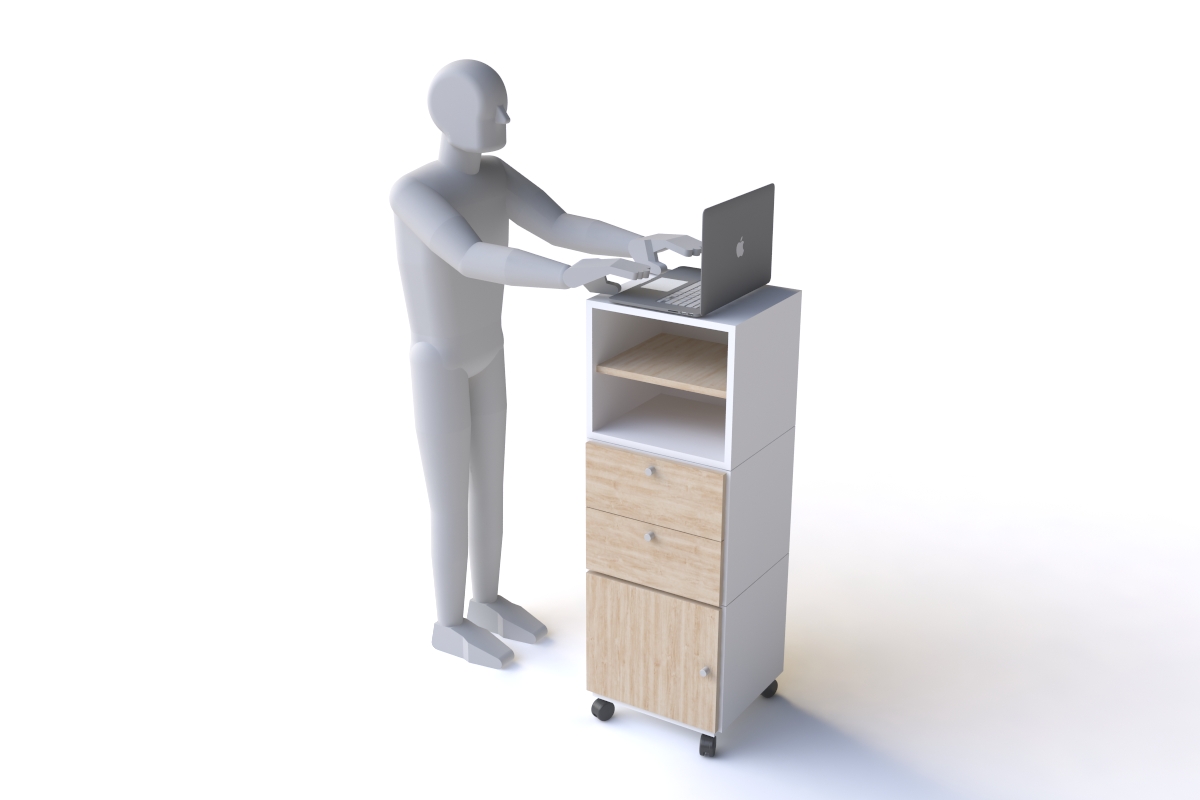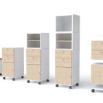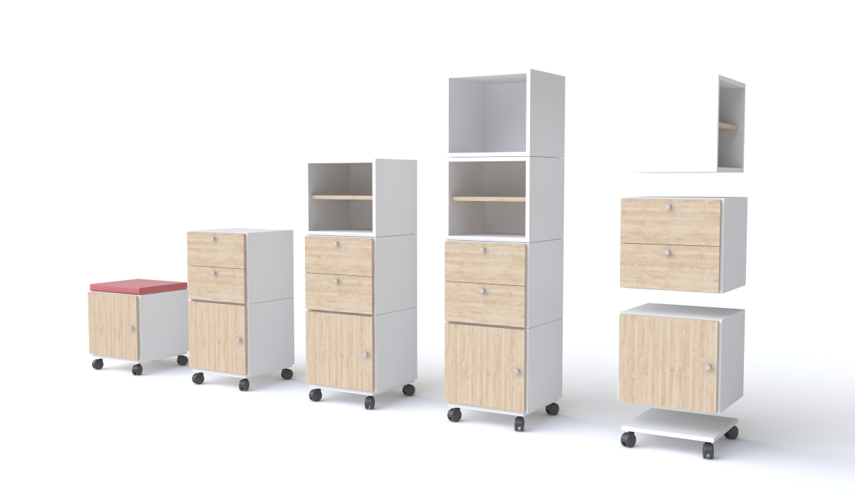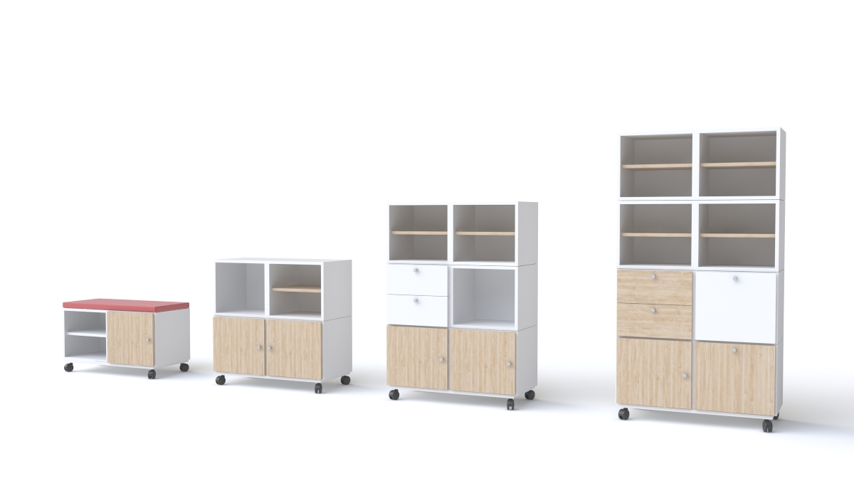 Módulos componíveis, com diversas configurações para cada necessidade de arquivamento. Nicho aberto, com prateleira, com porta, com 2 gavetas, com gavetão, ou tipo baú.